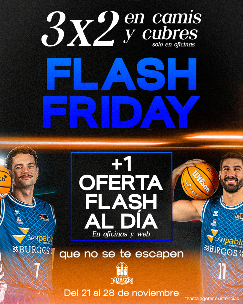 Además, el Flash Friday del San Pablo Burgos llega con una novedad especial: cada día de la próxima semana, a las 9:00 horas, se anunciará una oferta flash sorpresa, dentro de la que habrá descuentos en merchandising, promociones de entradas, etc., que solamente estará activa entre las 10:00 horas y las 19:00 horas de cada día, o hasta agotar existencias.